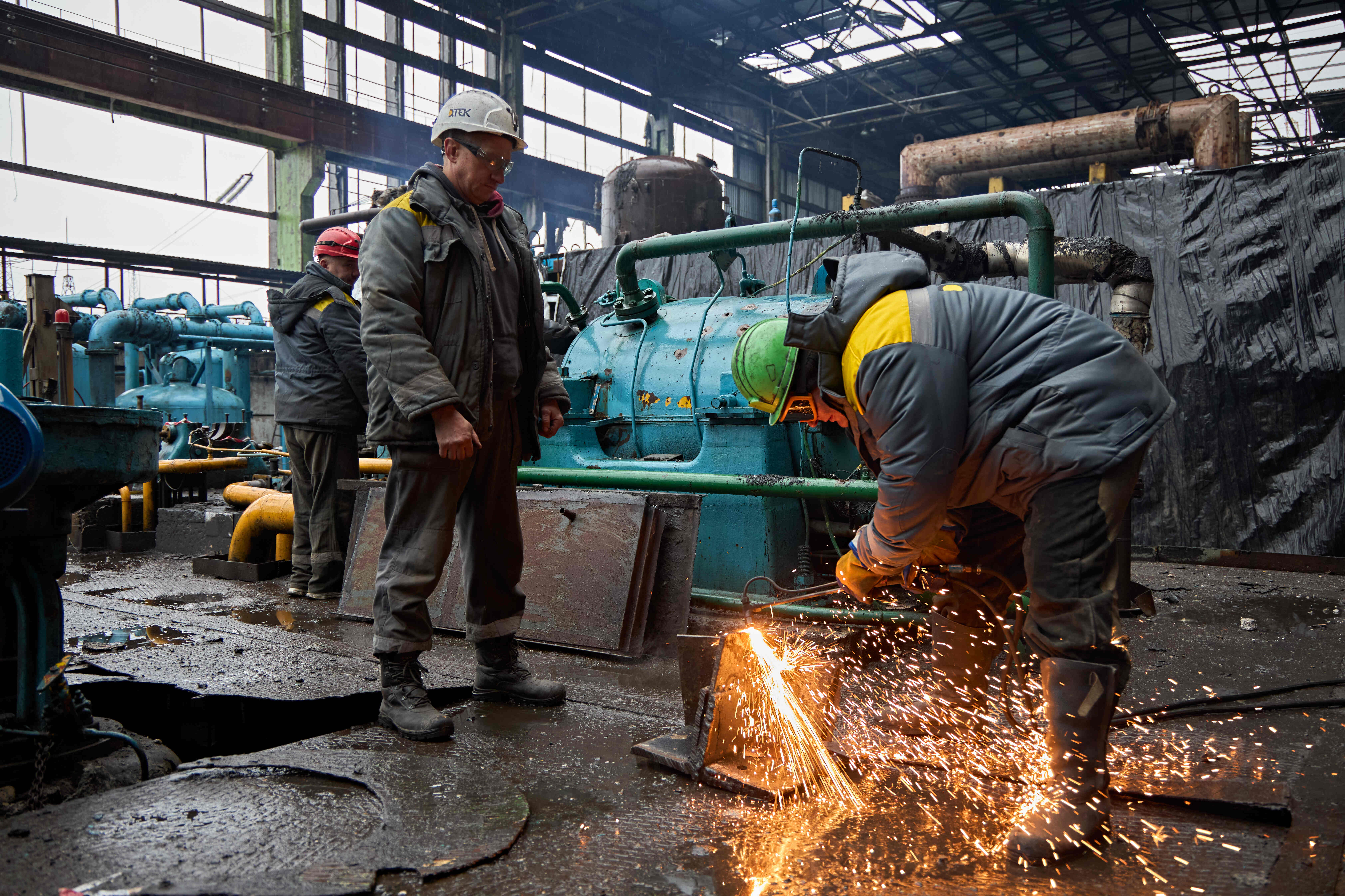 A DTEK employees work to restore a DTEK power station after russian attacks in March 2024. The precise location and date are not disclosed due to security restrictions.