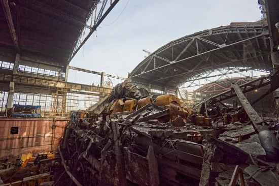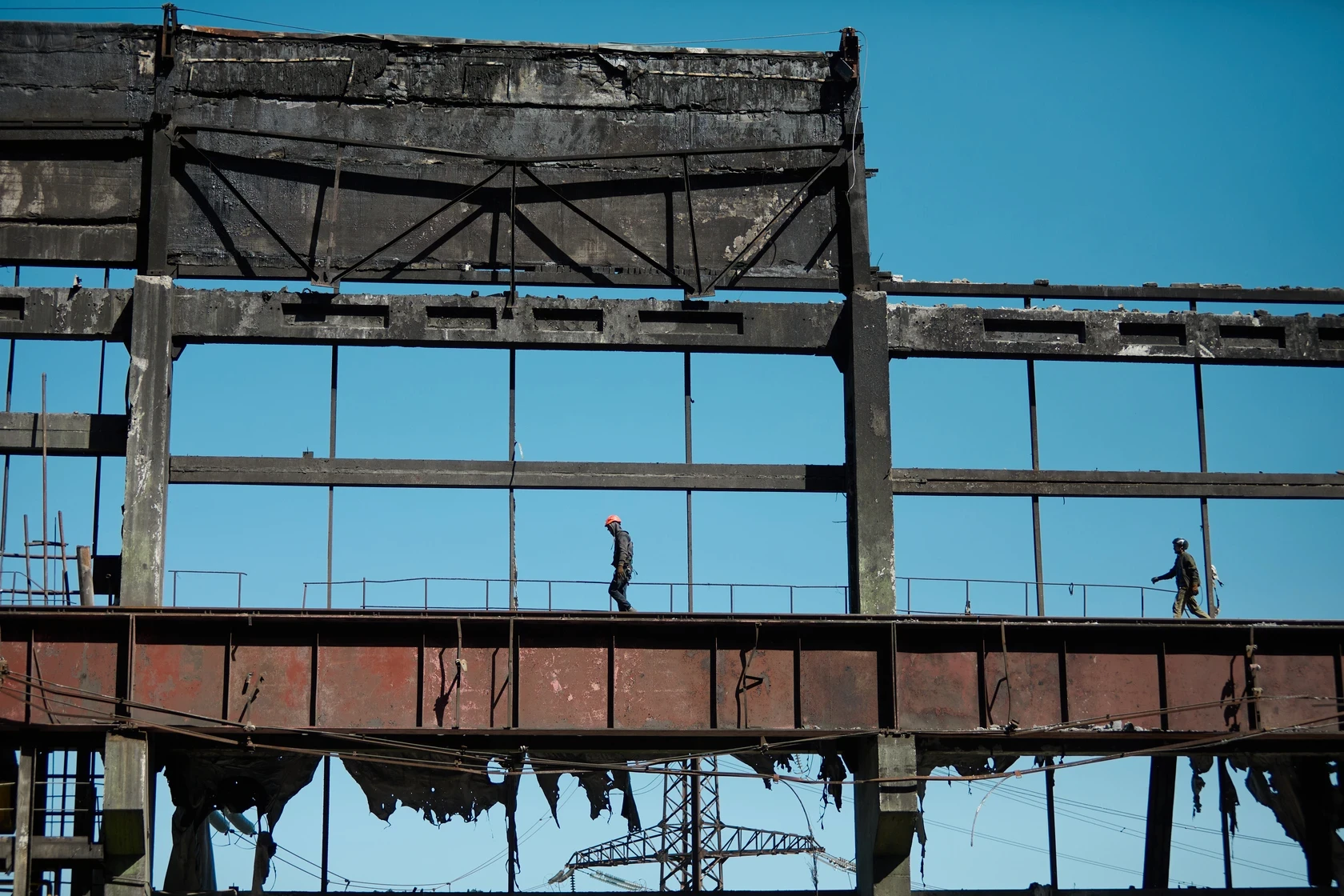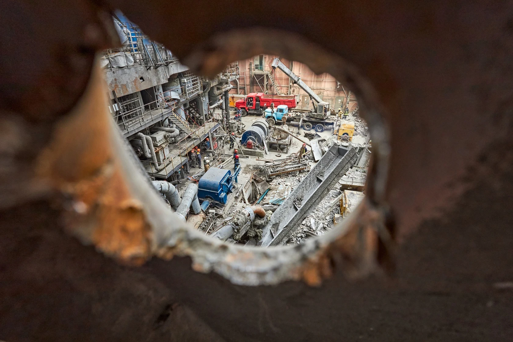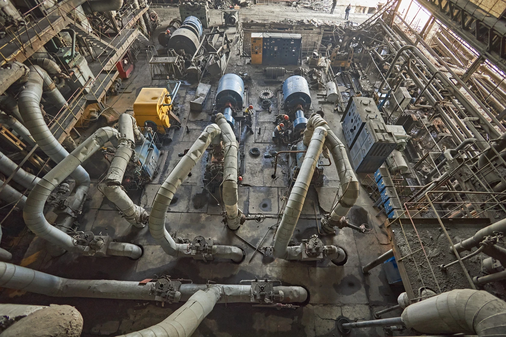 Exposed pipework, rubble and damaged equipment is all that remains of a once-active plant.Anastasiia Honcharuk, 2024