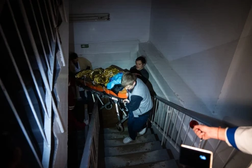 After a russian attack, 13-year-old Artur is stretchered up six flights of hospital stairs by torchlight to receive treatment. His arm was later amputated.Serhii Morhunov, for the Washington Post, 2023