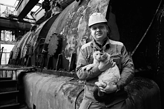 Oleg, shift manager, with Murka, a resident cat and survivor of multiple rocket attacks.