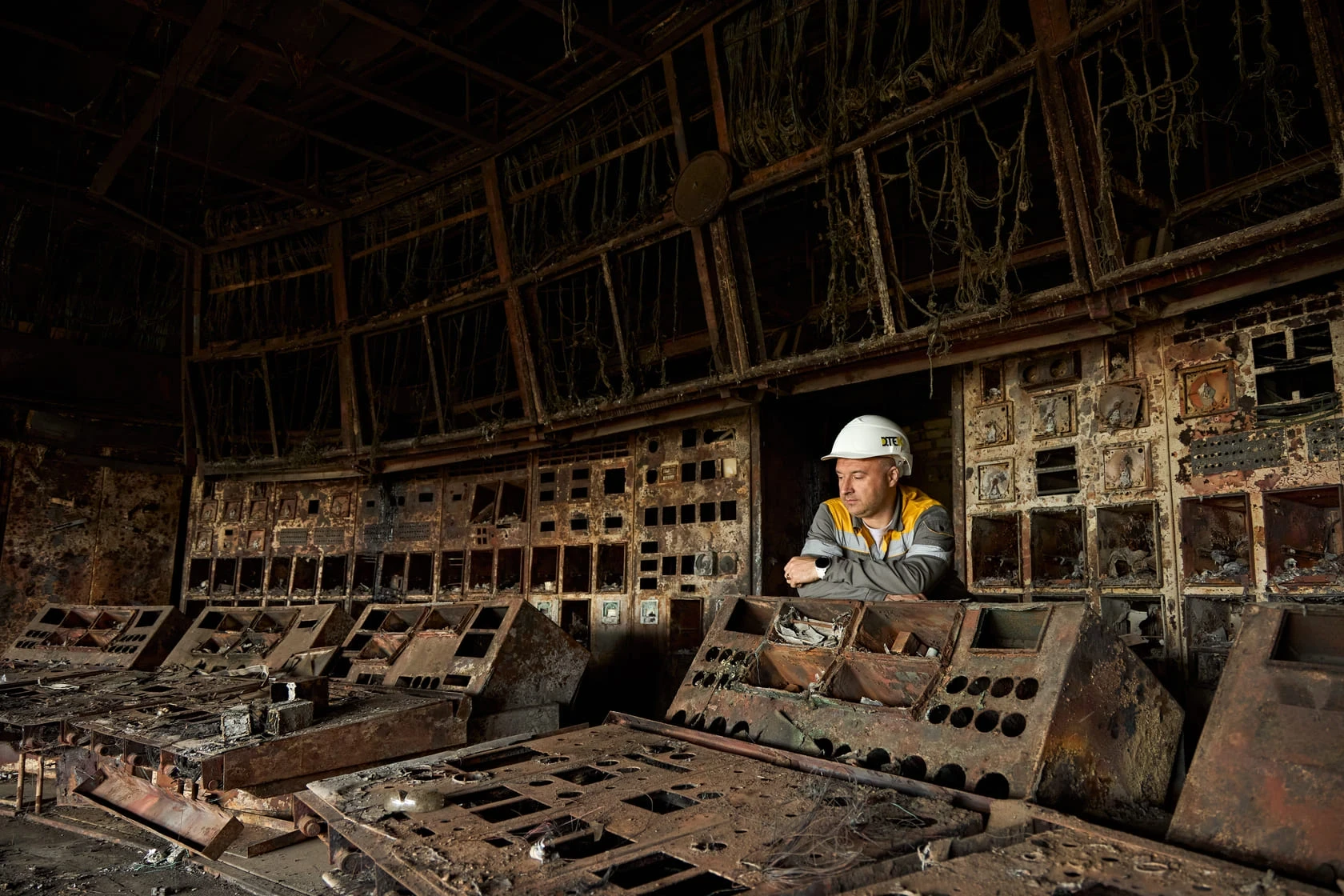 Power unit machinist Dmytro surveys the remains of a once-bustling control room.