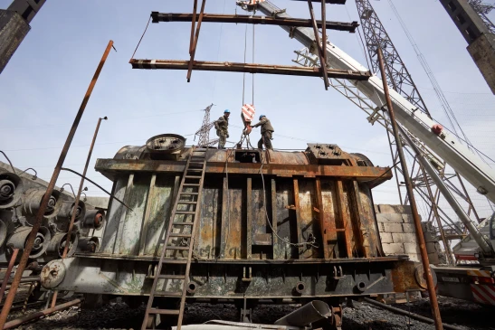 Two DTEK engineers prepare to remove a colossal transformer unit, scarred by multiple attacks.