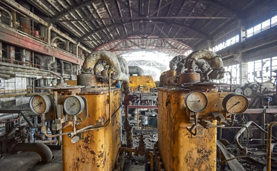 Exposed pipework, rubble and damaged equipment is all that remains of a once-active plant.